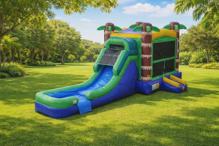The 12ft slide combo brings high-energy fun and island vibes to any event. This Tropical Palm slide combo combines a jumping area, climbing wall, and a smooth 12-foot sliding lane. Ideal for children ages 3–14, it delivers hours of safe, active play for backyard parties, rentals, and community events. ⚡️